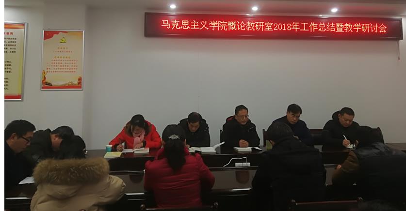 1月10下午,“毛泽东思想和中国特色社会主义理论体系概论”教研室在323会议室召开了教研室2018年工作总结暨教学研讨会。公司党委书记唐国战、副经理黄世明、周智、副书记何晓坚和“概论”课教研室全体教师参加了会议。会议由教研室主任胡春湘主持。