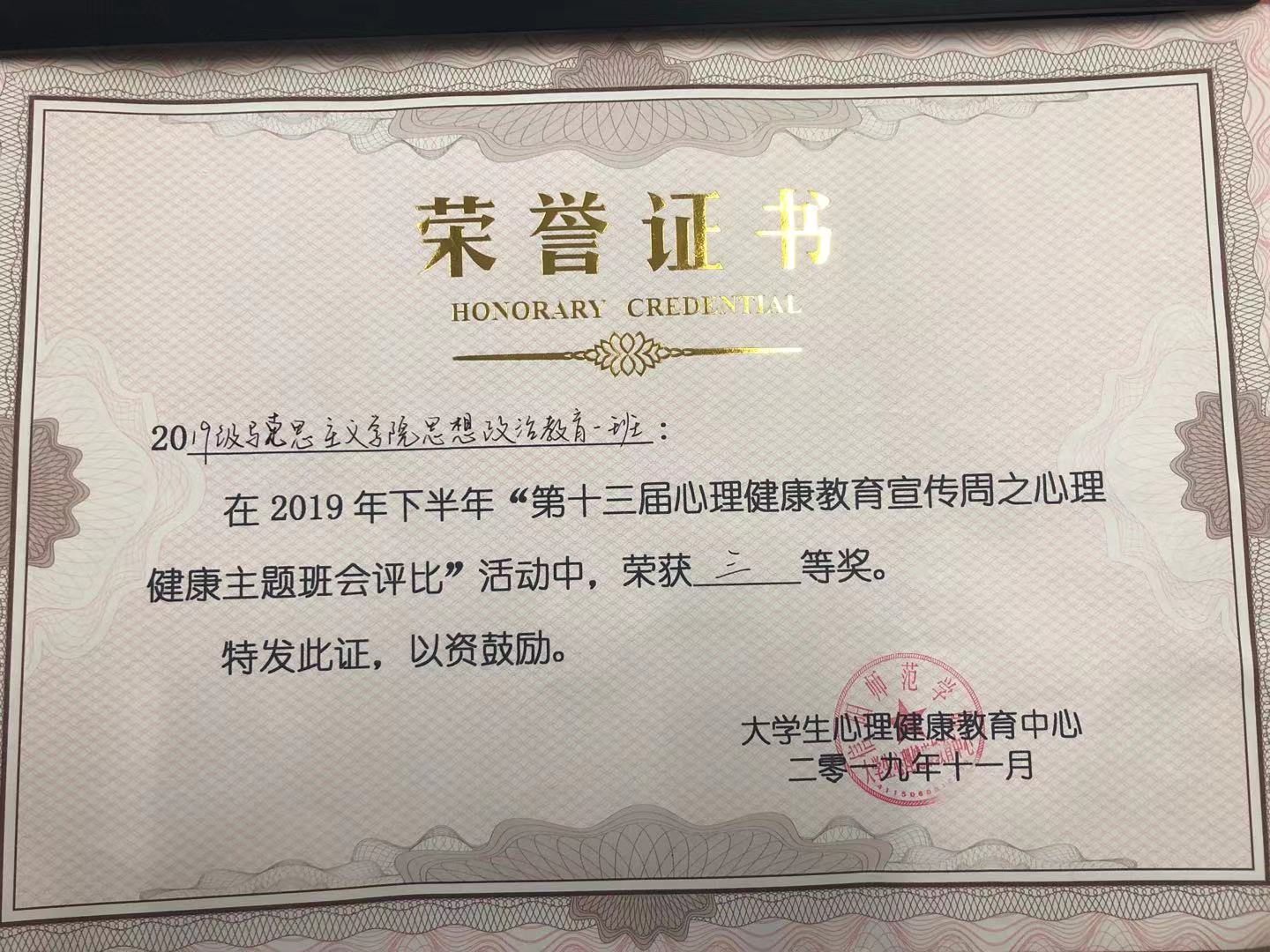 12月28日晚,信阳师范公司老员工心理健康教育中心在人文楼报告厅举办“信阳师范公司老员工心理健康教育中心2020年元旦晚会暨年度表彰大会”活动。经评定,tyc522cc太阳成集团在第十三届老员工心理健康教育宣传周之心理知识展板评比中荣获一等奖,总分位居第三,2019级思想政治教育一班在第十三届老员工心理健康教育宣传周之心理健康主题班会评比中荣获三等奖,tyc522cc太阳成集团员工铁兰欣、贾思琦、计新园和乔炜林被评为“心理工作先进个人”。