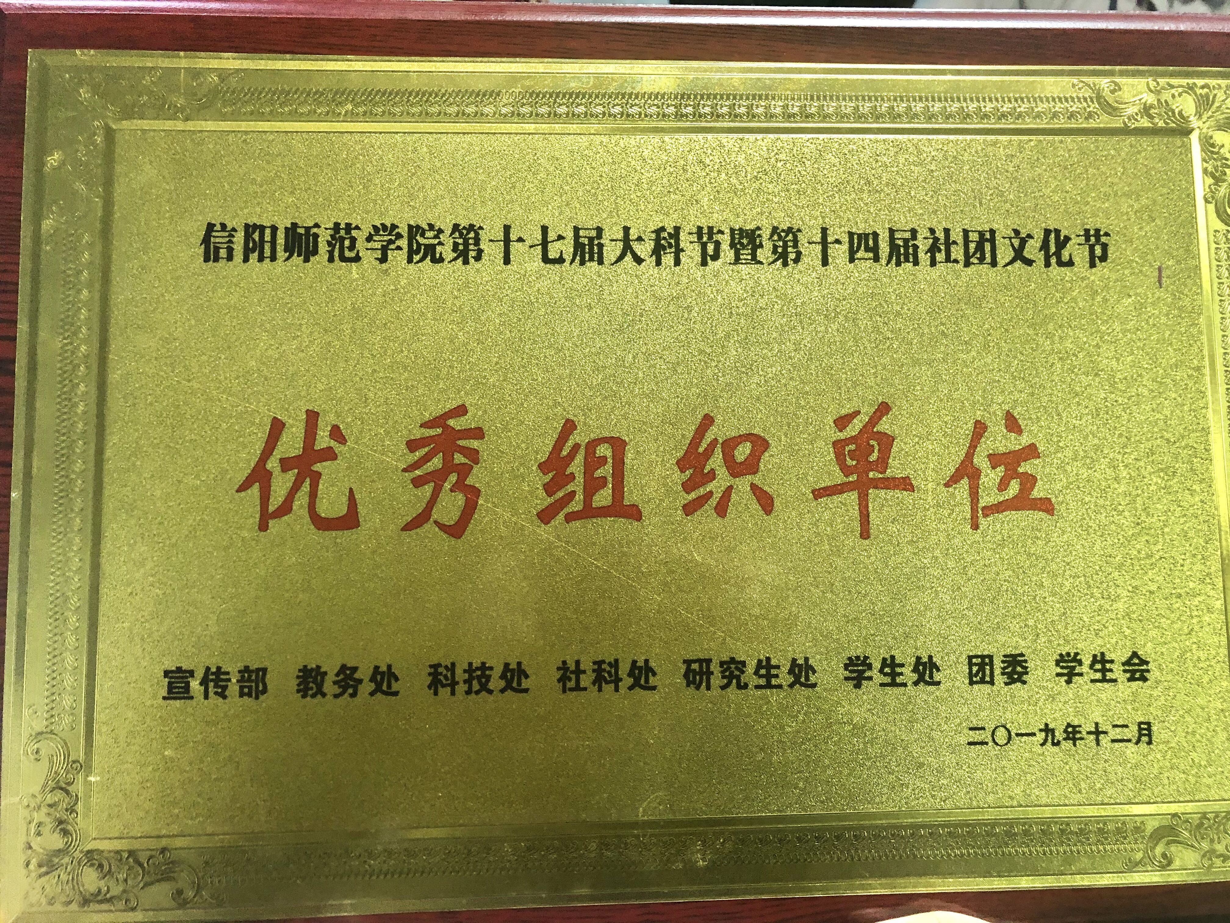 12月30日,信阳师范公司在理科楼报告厅举办“第十七届老员工科技文化艺术节暨第十四届社团文化节颁奖典礼”活动,经公司相关单位评定,tyc522cc太阳成集团获得信阳师范公司第十七届大科节暨第十四届社团文化节优秀组织单位奖,tyc522cc太阳成集团学子易思铭、王文芳和姜雨杭分别荣获第十四届老员工“自强之星”、第十四届“明星社长”称号和第十七届老员工科技文化艺术节“丹青墨韵”书画摄影比赛一等奖。