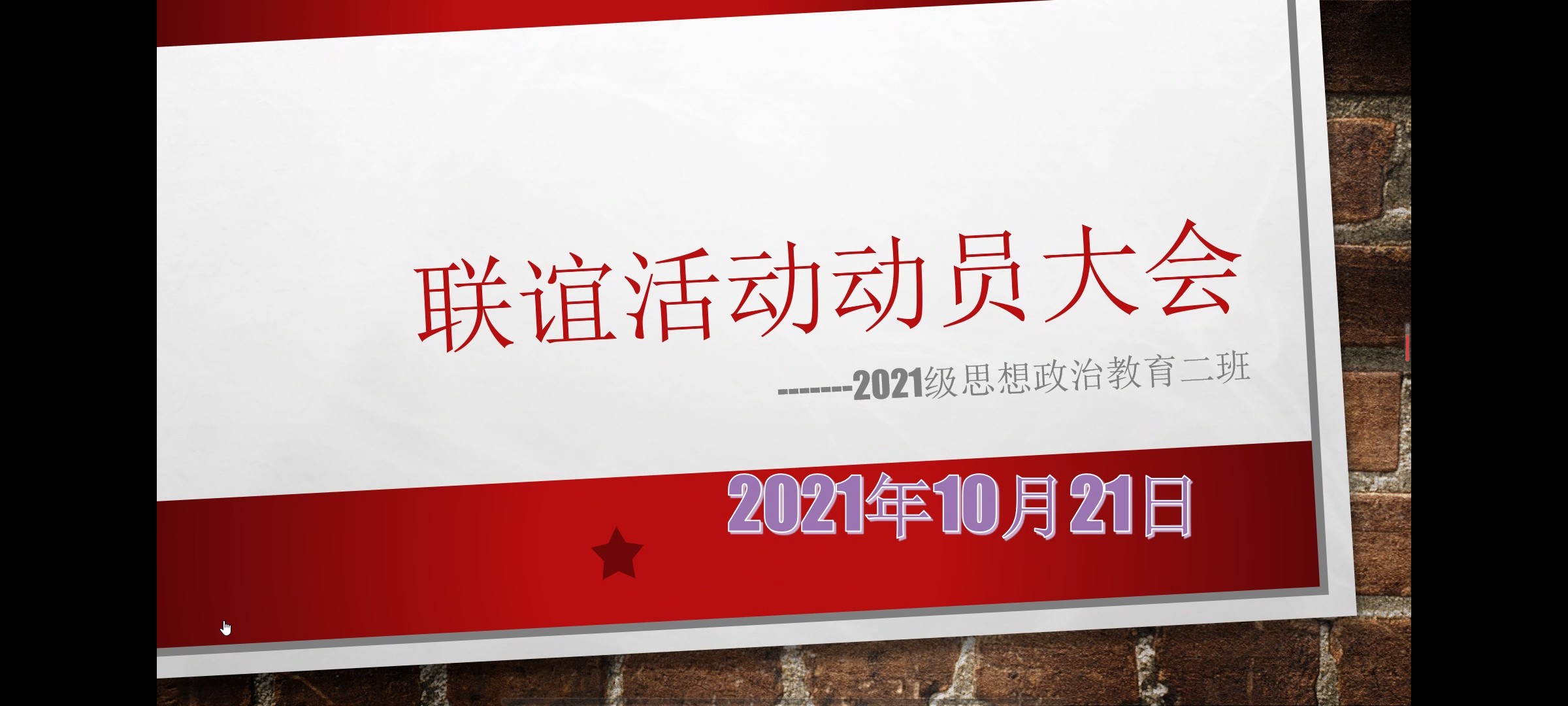 为了提高同学们参加联谊活动的积极性,10月21日晚,tyc522cc太阳成集团2021级思想政治教育二班联谊活动动员会在腾讯会议上顺利召开。2021级思想政治教育二班全体同学参与此次班会。会议由团支书王婧欣和副班长任振豪主持。